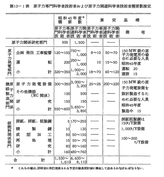 需要者数の推定については,放射線利用を除くあらゆる分野の原子力研究開発の業務に従事する科学者技術者をとりあげ,原子力関係研究部門,原子力発電部門,原子力関係機器製造部門,核燃料関係部門の四部門に分けて推定している。これらの部門についての推定に際しては,例えば,150MW級の原子力発電設備の製作,建設運転を行なう場合において必要な科学者技術,者数を推定し,これに32年末策定の「発電用原子炉開発のための長期計画」等による昭和45年度の建設中発電所基数を掛けて全体の需要数を導き出すという作業が行なわれた。これらの推定値には,きわめて多くの不確定な仮定が含まれているとはいえ,各部門別に,メガワット当りの需要数を推定し,これに出力数を乗じて算定するという方法は,この答申の大きな特色である。需要数推定表を(第13-1表)に掲げておくが,45年度需要数を推定する際に用いられたものが,31年度に策定された長期基本計画,32年度に発表された発電用原子炉開発のための長期計画であるから,これらの推定値は,当然今年末までに改訂され発表されることになっている新長期計画に準拠して改められなければならない。