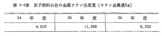 輸入ウラン精鉱をもとにして,金属ウランを生産した燃料公社の実績は第4-4表のとおり,36年度8,253トンで,これは国内の試験研究用に供給された。