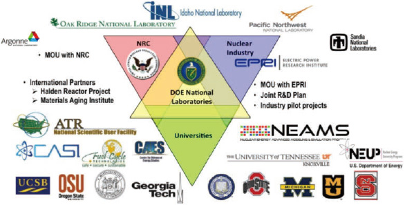 米国ではエネルギー省(DOE)が軽水炉持続プログラム(LWRS)を実施し、既存炉の寿命延長を目刺しつの研究領域(材料の経年劣化、原子炉安全、リスク情報を活用した安全裕度の評価、計測・制御・情報システムの改良)を設定し、研究開発を支援しています。本プログラムでは、アイダホ国立研究所を中心とした国立研究所のインフラ・資源を活用するとともに、米国の電力研究所(EPRI)を中心とした産業界と連携・協働して展開するとともに、NRCとも連携しています。