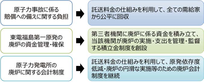 2016年の電力小売全面自由化により、従来の地域独占18や総括原価方式19による投資回収の保証制度が撤廃され、原子力発電も電力自由競争の枠組みの中に置かれています。一方で、原子力発電には、事故炉廃炉の資金確保や原子力損害賠償のように、市場原理のみに基づく解決が困難な課題があります(図2-17)。このような課題に対応するため、事故炉の廃炉を行う原子力事業者等に対して、廃炉に必要な資金を原子力損害賠償・廃炉等支援機構に積み立てることが義務付けられています。
