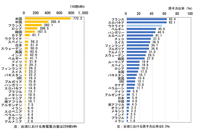 図 3-6 国の原子力発電電力量(左)及び発電電力量に占める原子力比率(右)(2022年)