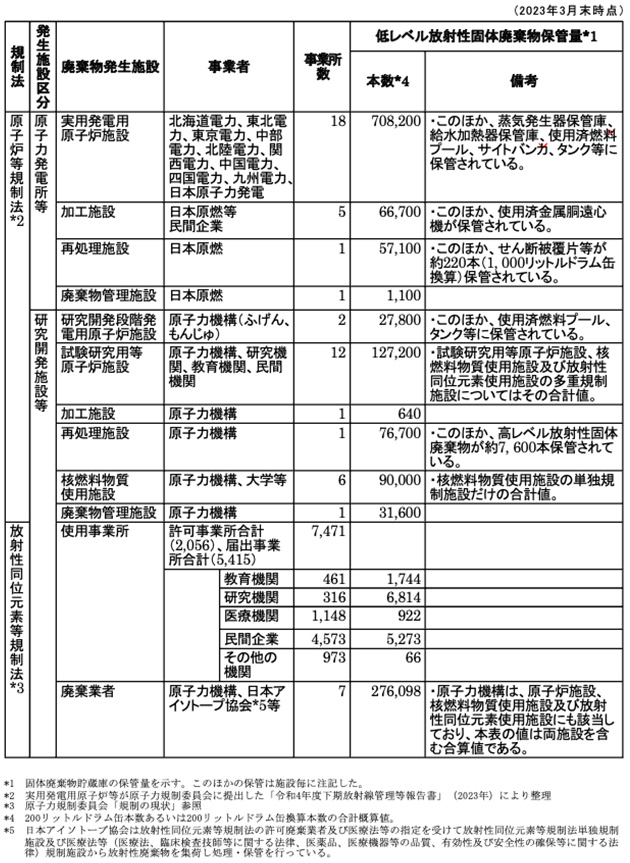 ドラム缶等に詰められた放射性固体廃棄物は各原子力施設等で保管されます。2023年3月末時点の我が国における低レベル放射性固体廃棄物の保管状況は表 6-10のとおりです。