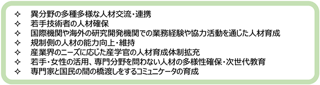 人材育成・確保及びサプライチェーンの維持・強化における課題は原子力関係機関の共通認識となっており、各機関の特色を生かしつつ、人材の育成等が進められています。人材育成に関する取組の重要性は、安全規制や放射線防護に携わる規制側の人材や、国民からの信頼を回復する上で重要な専門家と国民との間の橋渡しとなるサイエンスコミュニケーター等、原子力サプライチェーンの維持・強化に必要な人材においても同様です。また、人材育成・確保に向けた取組では、社会インフラとしての原子力分野の重要性の発信や、組織や専門分野の枠を超えた異分野・異文化の多種多様な人材交流・連携も重要です。
