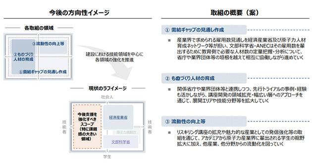 経済産業省は、NSCPの枠組みを通じ、原子力人材の育成・確保、部品・素材の供給途絶対策や事業承継、海外プロジェクトへの参画に対し、地方経済産業局とも連携した支援態勢を構築する取組を進めています。