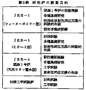等の理由から、わが国に建設する実用発電炉の第1号機として、英国系の天然ウラン黒鉛型を採用すべく耐震構造の問題等につき検討するのが妥当であると考える。 (2)初期段階における発電炉の国産化計画 第2表 国産化の傾向 (3)増殖型発電炉開発のための動力試験炉計画 さきに述べた初期段階における実用発電炉の国産化計画と並行して、わが国の原子力開発の目標の一つとして、燃料サイクルと世界的な技術の進歩の方向から見て増殖型動力炉を建設するための計画を促進する必要があるが、この型の開発には相当長期間を要すると思われるので、ほぼ昭和40年代の中ごろからこの型の発電炉が実用されることを目標とする。 第3表 動力試験炉設置計画 第4表 動力試験炉の設置目的 (4)研究炉の設置計画 初期段階における発電炉を国産化し、増殖炉を開発し、さらに広く原子力技術を開発するための各軽の基礎研究、材料試験、工学試験等を行うための研究炉は原子力の研究開発に不可欠のものであるがその設置計画を第5表に示した。 第5表 研究炉設置計画 表中、JRR−3までは、さきに当委員会が決定し、すでに完成もしくは目下進行中の計画であるが、材料工学試験炉については、原子炉ならびにこれに使用する機器材料の国産の進展にともない必要となるので、JRR−3の完成に引きつづいて設置するものとする。 第6表 研究炉の設置目的