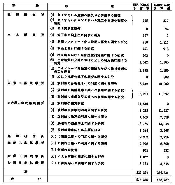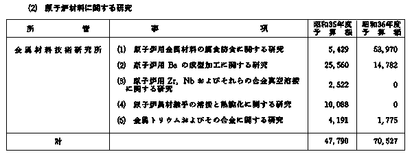 原子力委員会 昭和36年度原子力関係予算政府原案の決定 昭和36年度原子力関係予算は、年度中に支出可能な現金額75.8億円、債務負担行為額18.4億円である。これを35年度に比較すると現金額で0.4億円の微減となっている。 (1)日本原子力研究所 (イ)原子炉の運転および建設関係については、JRR-1が従来に引き続き定常運転を行なうほか、35年10月臨界に達したJRR-2が定常運転を行ない共同利用を開始する。JRR-3は36年度当初に据付を完了し、10月ごろ臨界に達する予定である。 (ロ)各種の試験研究関係については、物理、化学、工学、放射線利用等の研究をいっそう推進するとともに、将来の開発目標である増殖炉に関する研究特に半均質炉の開発研究を強化する。 (ハ)技術者の養成事業関係については、アイソトープ研修所、原子炉研修所の拡充を行なう。 (ニ)研究施設等の建設関係としては、原子炉特研、研究炉管理部格納庫および講堂の新設、開発試験室、廃棄物処理場の増築を行なうとともに前年度に引き続き再処理用ホットケーブ、ヴァン・デ・グラフ建屋の建設を行なう。 (ホ)研究業務の本格化に即応して150名の人員を増加し、また36年度末においては役員を含め1,347名(35年度は1,197名)とする。 (ヘ)以上の事業を遂行するため、民間出資2.5億円、営業収入および雑収入1.2億円を含め総事業費48.1億円(債務負担行為11.3億円)を計上し、36年度政府出資は44.4億円(債務負担行為11.3億円)となる。 (2)原子燃料公社 (イ)核原料物質の探鉱については35年度に引き続き人形峠および東郷鉱山に重点をおいて探鉱を行なうほか、山形・新潟県境小国地域、新潟県三川赤谷地域等の精査を組織的に行なう。 (ロ)採鉱試験は人形峠鉱山において二段採掘試験および水力採掘の基礎的試験に着手する。 (ハ)粗製錬、精製錬については35年度に引き続き国内鉱石および輸入イエロケーキをもって中間規模試験を行ないいっそうの技術の向上をはかる。特に後者については設備を増強、改善してウラン地金の向上と能率化を目ざして金属ウラン約12tを生産する予定である。 (ニ)35年度から発足した検査技術開発室においては、完成燃料体についての検査技術の開発につとめる。 (ホ)再処理関係の管理分析技術の開発、再処理工場建設予定地買収、再処理工場建設関係調査等再処理事業のための準備にとりかかる。 (へ)以上の事業を推進するため36年度は13.2億円を計上し、人員も35年度の476名を50名増員して526名とする。 (3)放射線医学総合研究所 36年度においては、さらに病院を拡充整備して、放射線障害の治療、診断およびアイソトープを利用した治療、診断等の業務を行なう。 (4)国立試験研究機関 各省庁所属の国立試験研究機関においては29年度以来、原子炉材料の研究等各種試験研究を行なっているが、36年度も原子炉材料、核燃料、原子力船、核融合反応、放射線利用、放射線測定、放射線障害防止、安全対策等についての研究を推進する。新規のものとしては、工業技術院電気試験所における放射線(能)標準確立に関する研究のためのリニアー・アクセラレータの設置(現金28,867千円、債務負担額96,224千円)、運輸省運輸技術研究所における原子力船の安全対策の研究のための高速電子計算機(65,112千円)、警察庁科学警察研究所におけるアイソトープ利用による警察科学についての研究(3,187千円)等を予定している。 (5)補助金、委託費 原子炉およびこれに関連する機器、材料の国産化のための研究、核融合に関する研究、原子力船に関する研究、原子炉の安全性に関する研究等を推進するため補助金1.8億円、委託費1.3億円を計上したが、核原料物質の探鉱奨励金12百万円および廃棄物処理事業補助金3百万円、合計3.25億円の予算を計上した。 (6)放射能調査研究 従来行なってきた調査研究を引き続き行なうものとし予算として47百万円を計上した。 (7)核燃料物質購入等 36年度中に外国から賃借または購入する日本原子力研究所の試験研究炉をはじめ大学その他の原子炉、臨界実験装置等に使用する濃縮ウラン等の賃借および購入のために必要な経費として12億円(債務負担額6.3億円)を計上した。 (8)原子力委員会の強化 原子力委員会に原子炉安全審査会(仮称)を付置し、原子力委員会における原子炉安全審査機能の充実強化をはかるものとし、所要の予算措置を講じた。 (9)原子力技術者の派遣その他 原子力技術者の海外派遣費については30百万円を計上し、35年度に引き続き専門技術者の海外派遣を積極的に行なうものとした。 (10)各省原子力関係行政費 関係各省の行政費としては、外務省における国際原子力機関のために必要な経費、原子力関係調査費等1.0億円が関係各省の予算に直接計上されることになっている