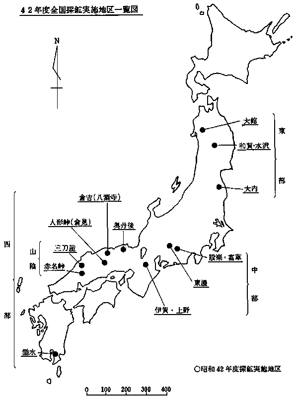 41年度に鉱床の一部が確認された三刀屋(みとや)地区(島根県)において、鉱量は握のため試すい探鉱を実施するほか、同地区西方、赤名峠(島根・広島県境)およびその周辺において地表調査、科学探鉱等により鉱床追跡を行なう。