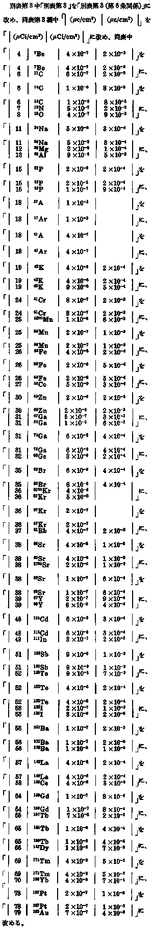 別表第1中「別表第1許容表面密度」を「別表第1(第3条関係)許容表面密度」に、「(μc/㎝2)」を「(μCi/㎝2)」に改める。 別表第2を次のように改める。 別表第2(第5条関係) 1ミリレムに相当する粒子フルエンス ![]() ![]() 別表第4を次のように改める。 別表第4(第6条関係) 種類が明らかでない放射性物質の場合の空気中の許容濃度 ![]() 別表第5を次のように改める。 別表第5(第6条関係) 種類が明らかでない放射性物質の場合の水中の許容濃度 ![]() |