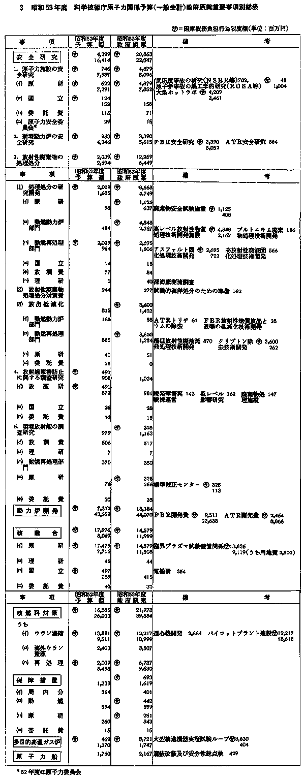 1 昭和53年度科学技術庁原子力関係予算(一般会計)政府原案総表 ![]() 2 昭和53年度科学技術庁原子力関係予算(一般会計)政府原案機関別総表 ![]() 3 昭和53年度科学技術庁原子力関係予算(一般会計)政府原案重要事項別総表 ![]() 4.昭和53年度各省庁別原子力関係行政費政府原案総表(Ⅱ項予算) ![]() 5.昭和53年度電源開発促進対策特別会計予算政府原案総表 ![]() 6.昭和53年度通商産業省原子力関係財政投融資予算等政府原案 ![]() |