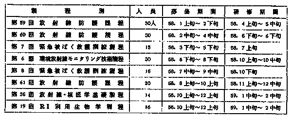 本年度は、養成訓練業務運営経費として、9,158千円を計上して本研究所の長期業務計画の方針に従い、教科内容の充実を図り、関連研究部との緊密な協力のもとに、次の8課程を実施し、180名の科学技術者を養成する。また、効率的かつ合理的な運営により研修効果の向上に努める。 ![]() また、内外の養成訓練制度について、調査を進めるとともに、研究成果の向上を図るために必要な研究を行う。 なお、養成訓練部においては、昭和34年度から昭和57年度までに、下表のとおり研修課程を実施し、課程終了者の累計は、3,106名に達した。 ![]() 第Ⅴ章 診療
