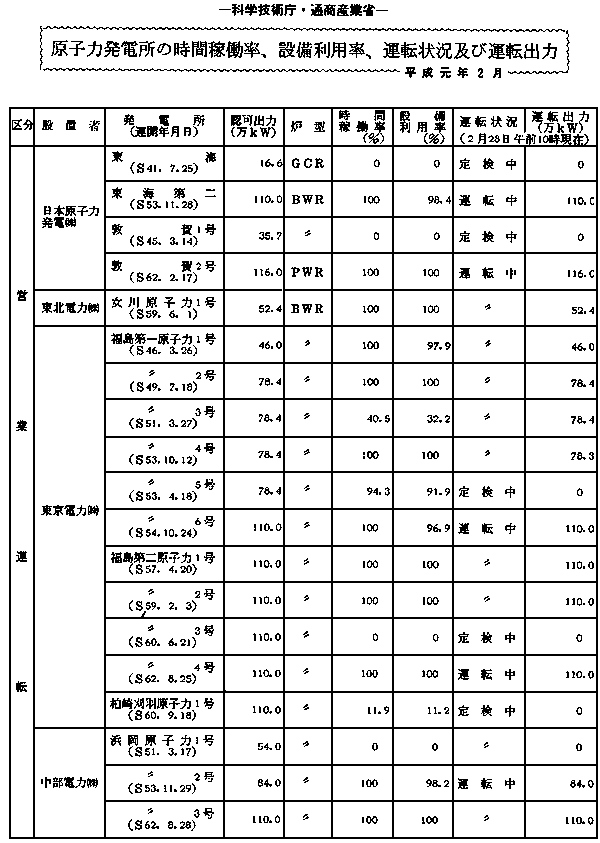 原子力発電所の時間稼働率、設備利用率、