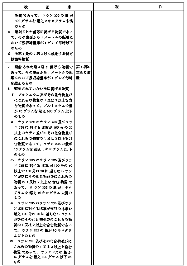 原子力委員会専門部会報告(昭和55年)に従い、核物質の種類及び量に応じ、以下の措置を講ずることを義務付ける。